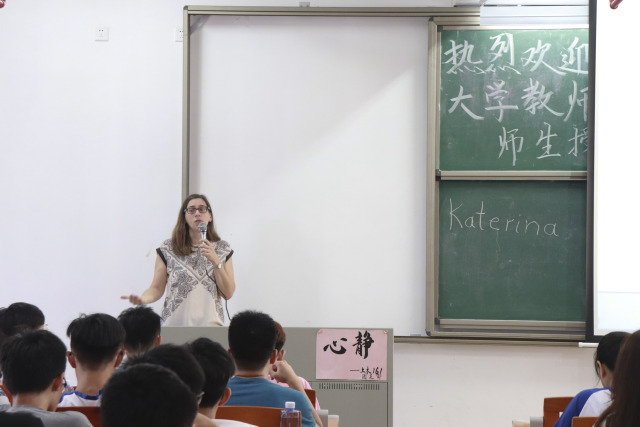 5月29日,英国爱丁堡龙比亚大学教师Katerina和Aamir Khokhar在为bevictor伟德官网员工授课。
