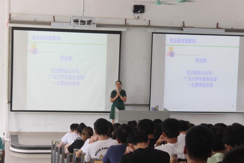接着周映萍老师给大家分析了当前的就业形势,重点介绍了乡村振兴、西部计划、老员工应征入伍政策等。同时还展示了往届毕业生的就业情况,考研、考公、应征入伍详情,提升同学们的就业信心,也拓展同学们的就业信息来源。周老师还围绕广东老员工就业创业平台的应用、求职简历的制作技巧、可靠的就业途径和面试环节的注意事项等方面对毕业生进行了有针对性的指导。周老师借用职业生涯规划课中的“寻找你的家族人脉”、“结识你的职场贵人”的方法,希望同学们学会主动寻找开拓员工资源、同学资源等,多交流联系;也可以向已经求职成功的同学请教,甚至问询同学公司是否还要再招人;主动去联系师兄师姐,拓展人脉,为自身就业寻求更多的指导和帮助;留意老师平时发布的各种求职信息。同时讲述了毕业生如何填写“高校毕业生登记表”“高校毕业生推荐表”、如何办理“三方协议”及合同签约手续等问题,帮助同学们更顺利的就业。