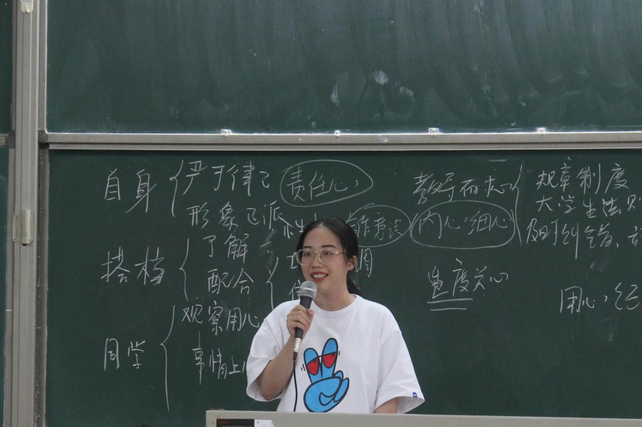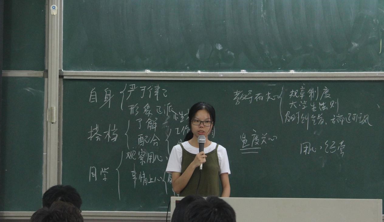 接下来,新一届助班代表唐杞柔进行发言。她表示新一届的助班一定会总结优秀前辈们的经验,全身心地投入工作,及时帮助新生解决问题,向新生介绍专业知识,引导他们更快更好地适应大学学习生活,度过一段充实有意义的大学时光。