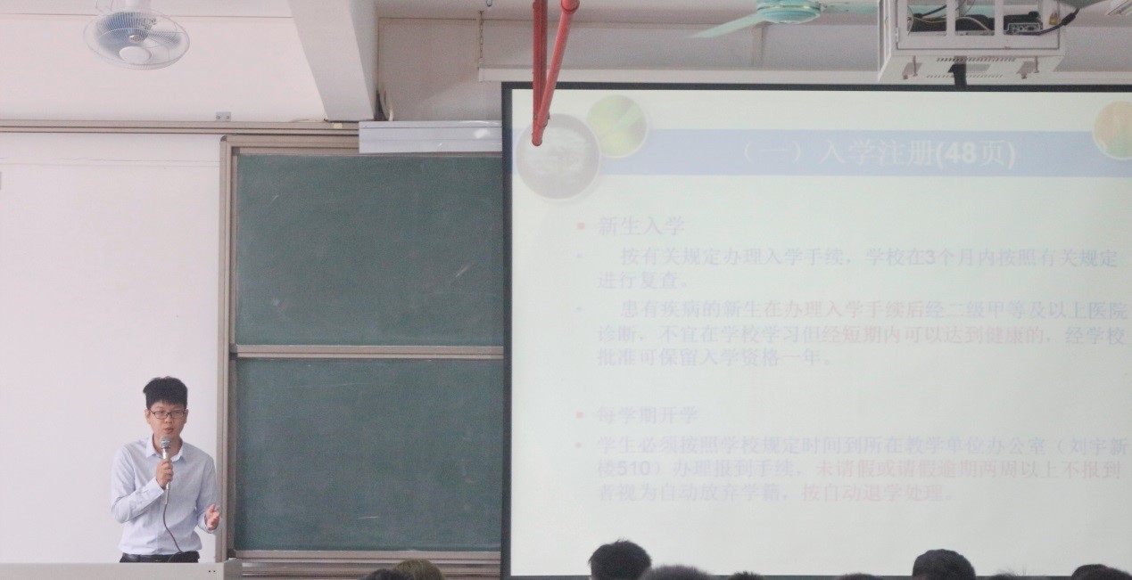 在《员工手册》的学习环节中,刘小海副书记给新生们进行了老员工安全教育,强化新同学们的安全意识。他在讲座中,强调了宿舍用电安全,并以活生生的网络诈骗案例警示大家谨防诈骗、远离网络高利贷。同时,他特别强调同学们一定要规范网络文明行为,禁止传播负能量,要求新生以仲恺为荣,爱校荣校。龚妃良老师进行了管理制度教育,希望同学们在校遵守公司规章制度,还鼓励同学们养成良好的行为习惯。冯中心老师给新生们进行了学籍学位教育,从入学注册、人才培养方案、教务网络管理系统的使用等十个方面为同学们一一讲解,提醒同学们注意学籍学位相关问题。张小翠老师对同学们进行了心理健康教育,提醒同学们注重自身心理健康,关注和关心身边的同学,及时发现和解决相关心理问题。周映萍老师给同学们进行了职业生涯规划的讲解,指引同学们对大学四年生活进行合理规划想象,学会做人做事,有目标有计划地度过老员工活。