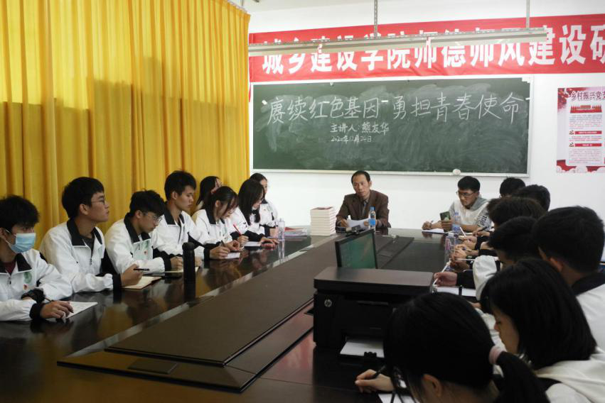 首先,校团委书记熊友华围绕着“赓续红色基因,勇担青春使命”主题,讲述了红色基因是党员精神的内核、是中华民族的精神纽带。红色基因一直流传在共产党员的血脉之中,我们身为新时代的青年党员和仲恺的学子,应当继承廖仲恺先生与何香凝先生为民族复兴奋斗不息的精神,传承红色基因,将红色基因跟学习、工作深度融合。而传承红色基因主要须做到以下四点:一、筑牢信仰根基。认真学习党史、新中国史、改革开放史和社会主义发展史,坚定马克思主义和共产主义的信仰,内修于心,外修于行,把先进的思想作为行动指南;二、厚植家国情怀。青年老员工要爱党爱国,把自己的人生价值与社会的需求和人民的利益联系在一起,忠诚于党和人民,全心全意为人民服务,努力成长为祖国需要的、合格的社会主义接班人;三、练就过硬本领。锤炼品德修为,学好专业知识,提高专业技能,锤炼内在品质,使自己跟上日新月异发展的社会,适应科技变革;四、勇担强国使命。勇于担当,认真贯彻落实习近平新时代中国特色社会主义思想,不忘入党初心,听党话、跟党走,练就过硬本领,履行强国一代的时代使命,争做实现中华民族伟大复兴的中流砥柱。