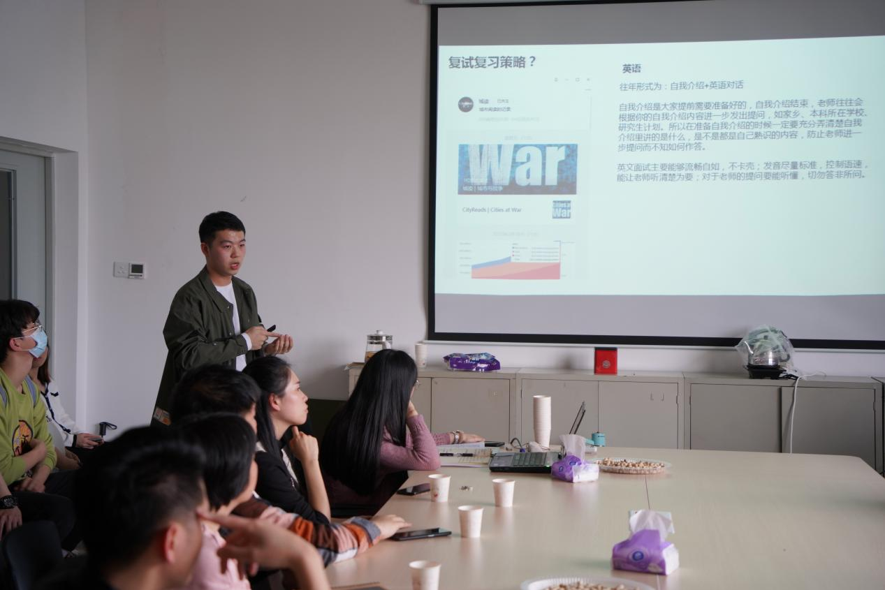城乡规划专业、土木工程专业、给排水专业的老师们及师兄陈福荣依次针对各专业特点为同学们分享了考研复试的方法与注意事项。杨智诚老师强调在考研复试前应充分了解自身情况,明确考研目的,考虑未来发展方向,可通过师兄师姐了解导师情况和专业侧重点,从而合理选择专业偏向。伦可欣老师则从复试内容、如何备考、是否调剂三个方面来讲解考研复试技巧。她提到,复试时要注意不同院校有不同的侧重点,面试的关键在于自信的状态和合理的眼神交流,在做好相关基础知识复习的基础上可联系导师进行自荐,而在调剂择校时需把握机会、大胆投报。陈福荣师兄也毫无保留地分享了他当年的考研经验。他先罗列出部分数据供同学们参考以判断自身能否进入复试,并强调面试时前后兼顾,简历中凸显自身专业优势,准备线上与线下复试两种情况。陈秋丽老师也建议大家,调整心态,扎实备考,积极咨询师兄师姐关于报考院校的准备工作,可以做复试与调剂两手准备。在准备调剂时,结合往届师兄师姐建议多加考虑。同时建议分数较低的同学,提前做好调剂准备,谨慎择校,合理择优。
