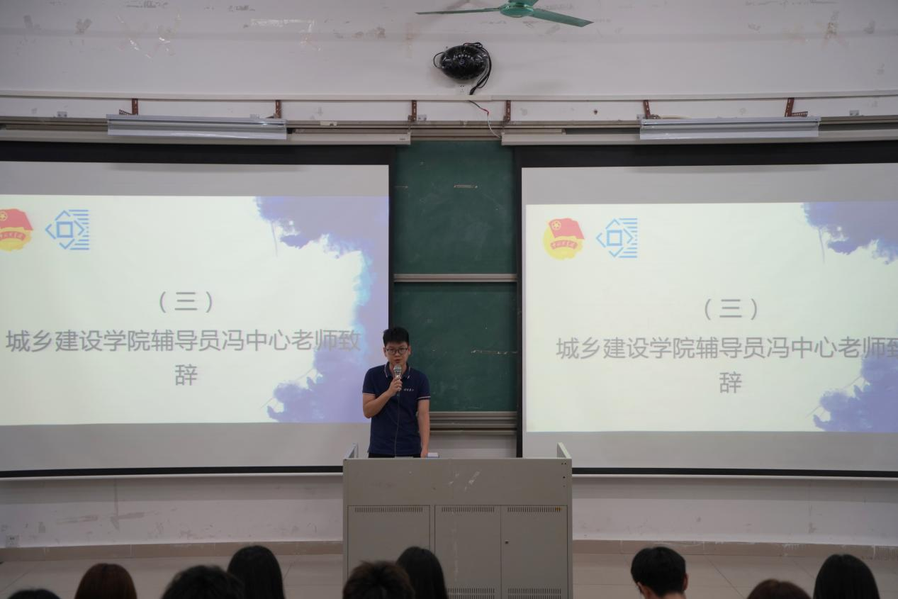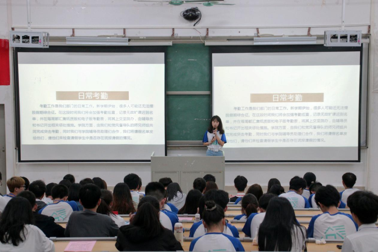 会议第一项议程,全体肃立,奏唱团歌。随后,冯中心老师上台致辞,明确此次例会的重要性,希望同学们认真对待,把握各部门服务同学们的工作重点,总结过去的经验,各部门相互学习交流合作,以此达到此次会议顾往瞻来的主要目的。