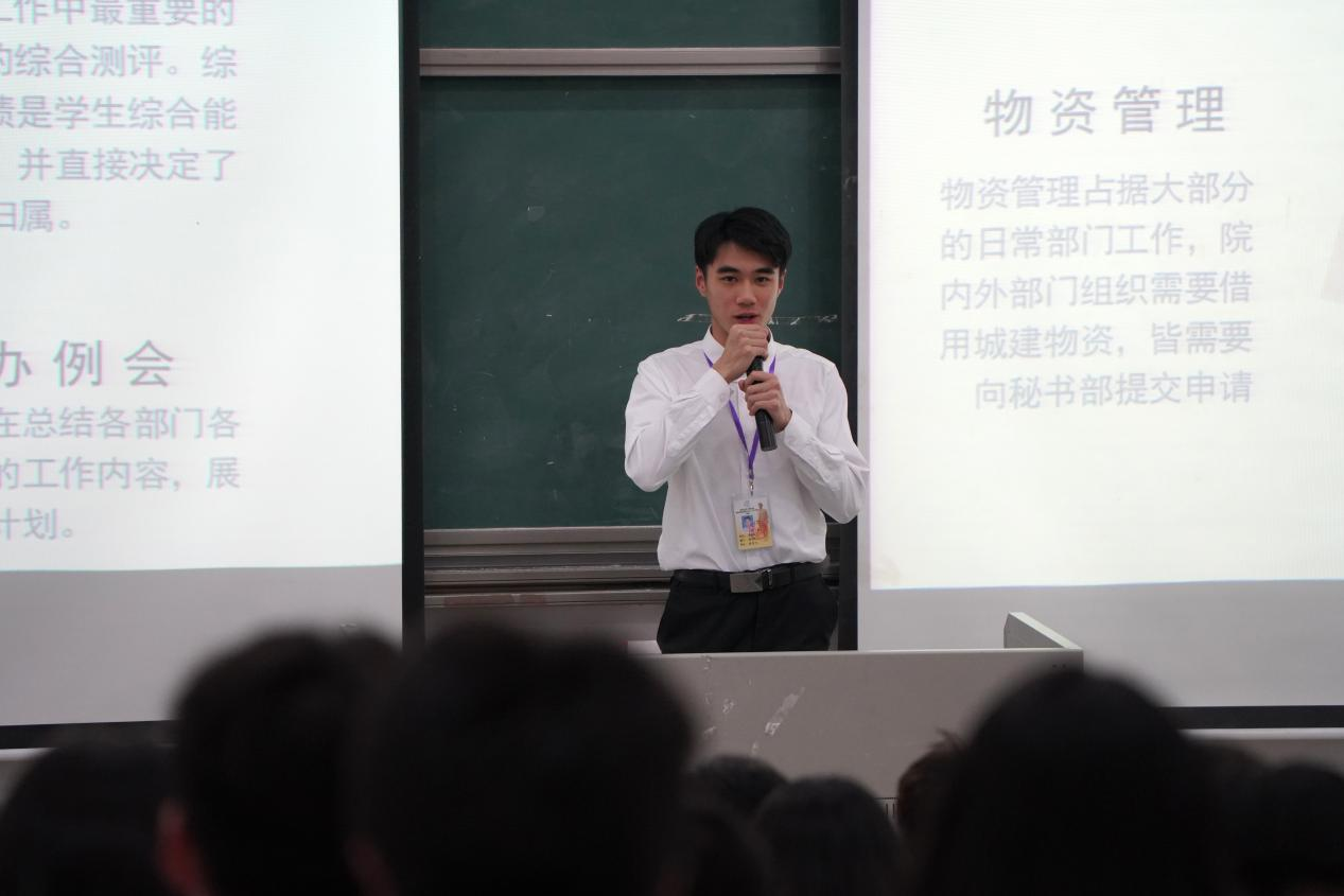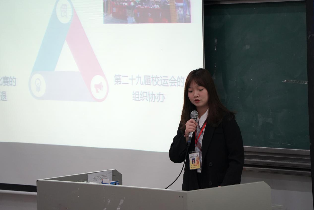 之后,团委各部门代表、员工会各部门代表、新闻中心各部门代表和解忧摆渡站代表依次上台发言。他们就各部门分工情况与工作特点进行简要介绍,分别总结了上学期的工作成果,指明仍需改进的不足,向大家展示新学期的工作规划,同时还分享了部门成员的日常趣事,展现了各部门苦中有乐的一面。