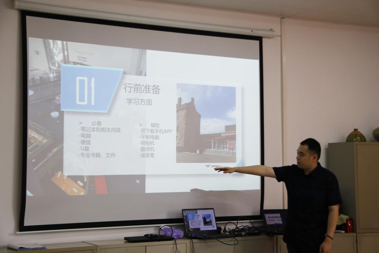 会议开始首先由陈卓分享个人留学经验。陈卓分别从学习及生活两方面进行讲解。他提到,学习方面的行前准备中必备的有笔记本和相关用具,对应的书籍资料等,其次也可以预下载手机APP,携带平板电脑、翻译机、录音笔等辅助职工进行更好地适应学习生活。行前准备中关于生活方面必备的是个人文件资料、现金、生活用品等,也需用到药品、信用卡等生活辅助用品。到达留学目的地后,尽快适应自己的生活环境,学习环境,对周边环境有一定的了解,才能够使自己的精力充分集中在学习上。