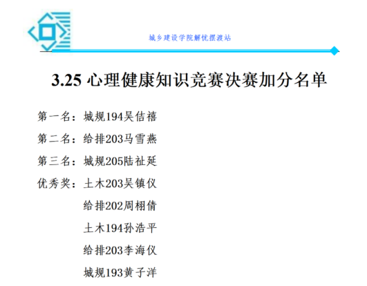 本次活动反响强烈,同学们积极参与。经过激烈的角逐,共计八名同学获得决赛名次,另有若干同学获得初赛加分。本次心理竞赛可以使同学们在自我领悟、自我反省、自我提高的过程中达到自我教育,活动进一步帮助同学们树立维护心理健康知识的意识,加强心理健康素质,为今后的学习生活奠定了基础。