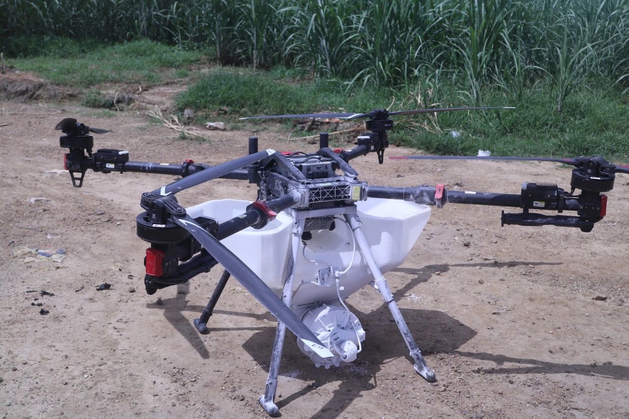 抬头看着蓝蓝的天空,我们还注意到空中时不时有施肥的无人机飞过。穿过一大片甘蔗种植地,我们找到了正在操控无人机的工作人员,从他口中我们了解到了使用无人机施肥可以大大节省人力成本,极大的提高了生产效率。人工施肥需要大半个月的时间,可是无人机仅需要两天就可以完成,无人机同时还能监控是否有病虫害的发生。